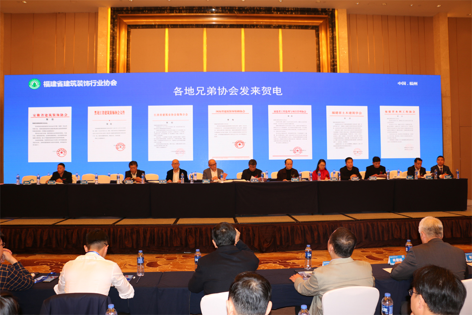 大会首先介绍到场的领导和嘉宾,与会代表对他们的到来表示热烈欢迎和衷心感谢。同时,大会主持人宣读中国建筑装饰协会发来的贺信,并在现场通过LED大屏播放展示上海、江苏、浙江、山东、安徽、江西、天津、重庆、黑龙江、河南、山西、陕西、广西、辽宁、深圳等兄弟省、市装协,以及福建省工程监理与项目管理协会、土木建筑学会、省水利工程协会等兄弟协会发来书面贺信,北京、辽宁、湖北、甘肃、大连、长春等省、市装协,以及福建省房地产业协会、省物业管理协会、省建筑产业现代化协会等兄弟协会发送微信祝贺。