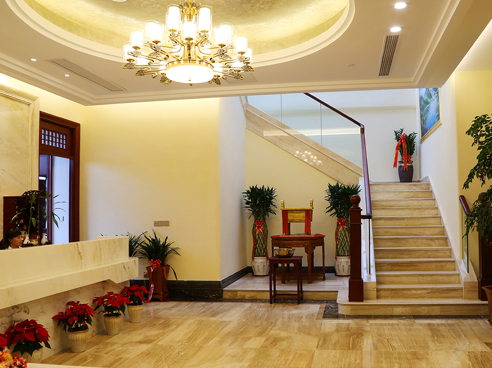3、装饰细节考究:大堂内的飞天壁画《归来兮》俏然凌空飞舞,既具古典美又现代新颖,成为大堂的一道亮丽新景。大堂吧引入石材景观墙,在灯光烘托下营造出浓厚的东方意境,白色景观墙线条干净利落又婉转流畅,结合点点光影,赋予空间独特而考究的内涵气质。