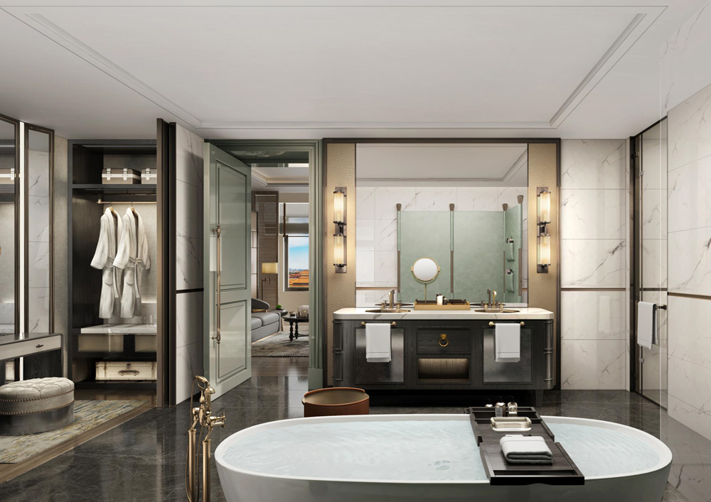 2、空间设计精妙:入口区域巧借东方园林布局手法,通过现代手法演绎曲径回栏,营造出层层递进的秩序感,使宾客在进入酒店的过程中,能够逐步融入环境,感受建筑的独特气场。大堂顶部天花板将中国建筑斗拱的形式艺术化表达,层叠有序,庄重肃穆;黑白的旋转楼梯作为空间交通及视觉的双向焦点,梯身蜿蜒,赋予空间独特的节奏美感。