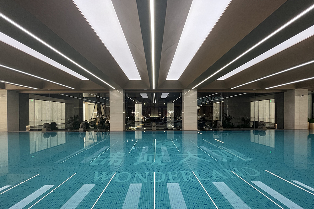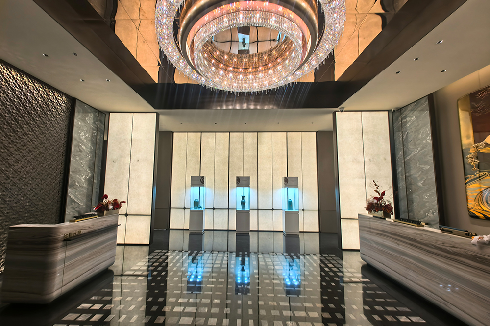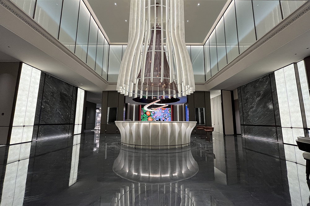 1.5.2m高弧形透光云石灯片工艺。以不锈钢骨架支撑0.3m宽、0.04m厚的弧形云石灯片,专用胶固定确保弧度流畅。通过灯光漫反射技术实现全域无光斑发光,光线均匀穿透云石肌理,兼顾结构稳定性与光影艺术。