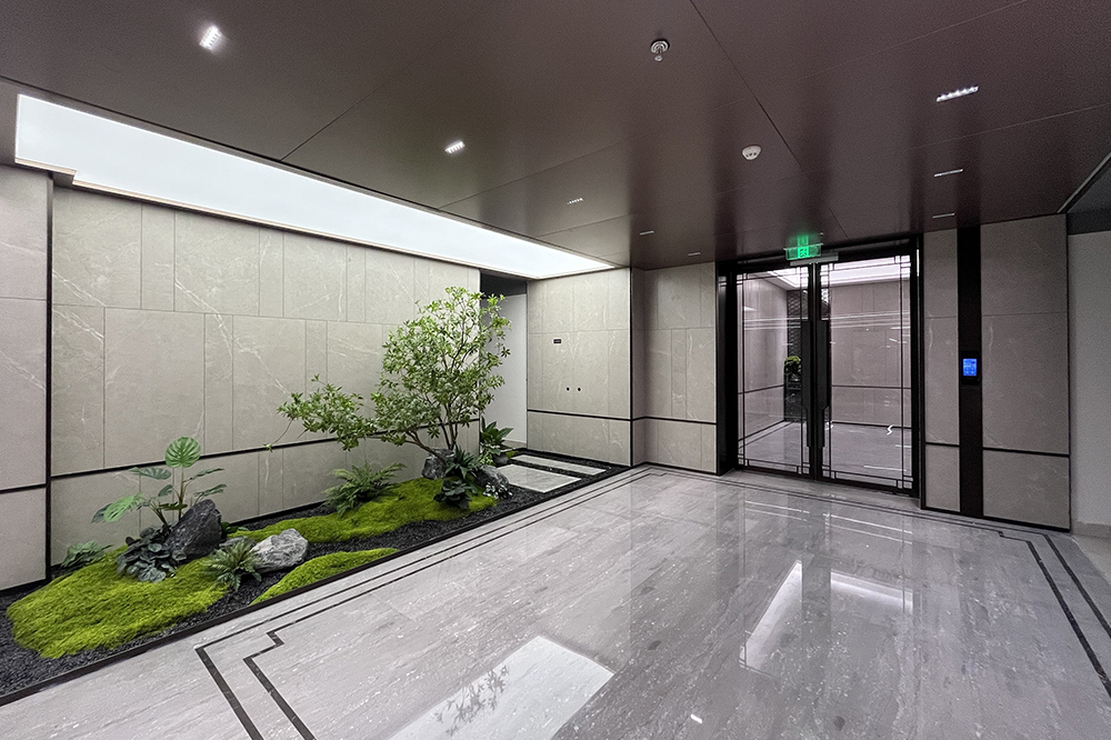 2.2m×3m石材大板安装工艺。采用“角钢加密骨架+铝合金背栓挂件系统”双重固定,防止石材大板变形脱落。施工前电脑预排版天然纹理,按编号精准拼接,达成"一石连纹"视觉效果。
