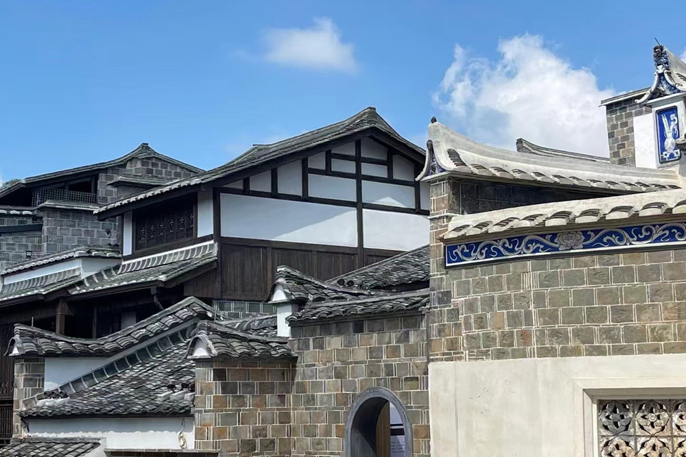 工程亮点:传统建筑屋面风格:屋面结构形式:椽板+望板 +屋面本瓦+屋脊;以青砖青瓦材料为主,后期受西方影响,出现红砖红瓦。传统民居大部分采用硬山为主(歇山建筑主要用在独立式院落中),两侧山墙高高耸起,起到防火及装饰作用。传统民居中屋面正脊一般两侧略微升起。而在大型民居中由于屋面巨大,根据开间分为五段屋面,明间屋面两侧翘脚做燕尾脊或鹊脊,次间屋面一端接明间墙面一端起翘,梢间不起翘直接收山墙内。