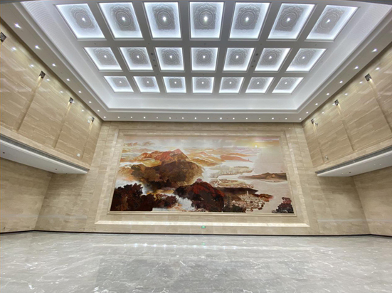 门诊大厅巨型人造石成品壁画根据高清定样山水画图片,通过设计优化,将每片尺寸控制在1198mm*1517mm*25mm。经过电脑深化排板在专用5D喷绘机喷绘在人造石表面,再经过生产线表面高温固化及表面防护增光,形成了一副18230mmx16340mm的巨型山水画!
