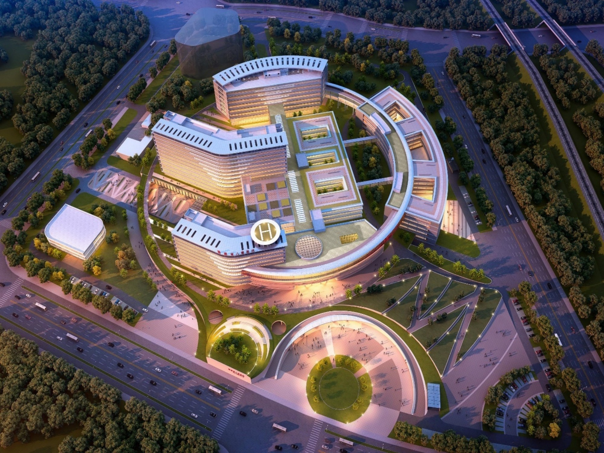各建筑单体通过医疗主街相联,由南往北设有南病房楼、医技楼、北病房楼和科研行政医学中心,医疗街往东设有门诊楼和配套用房及教学交流中心,鸟瞰建筑的外轮廓近似半个圆环,构建出“虚圆实方”的整体建筑造型。