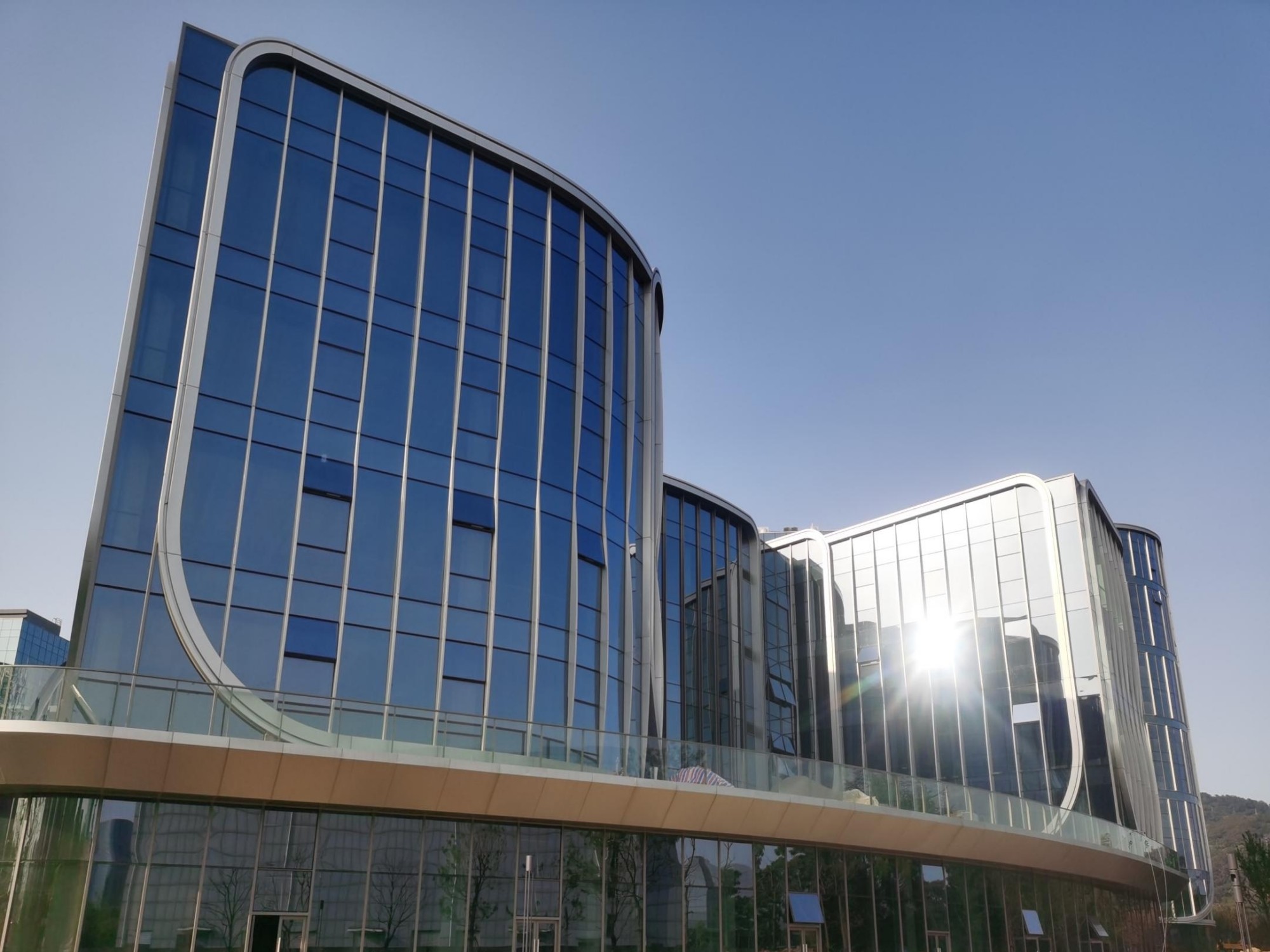 办公楼外立面采用玻璃立杆采用类‘帆船’效果,在外幕墙帆船扣盖连接做法上内部有多个构件组成,通过螺栓机械连接角码,形成了“千帆竞发”的主旨和花瓣状布局,具有独特的艺术性和标志性。