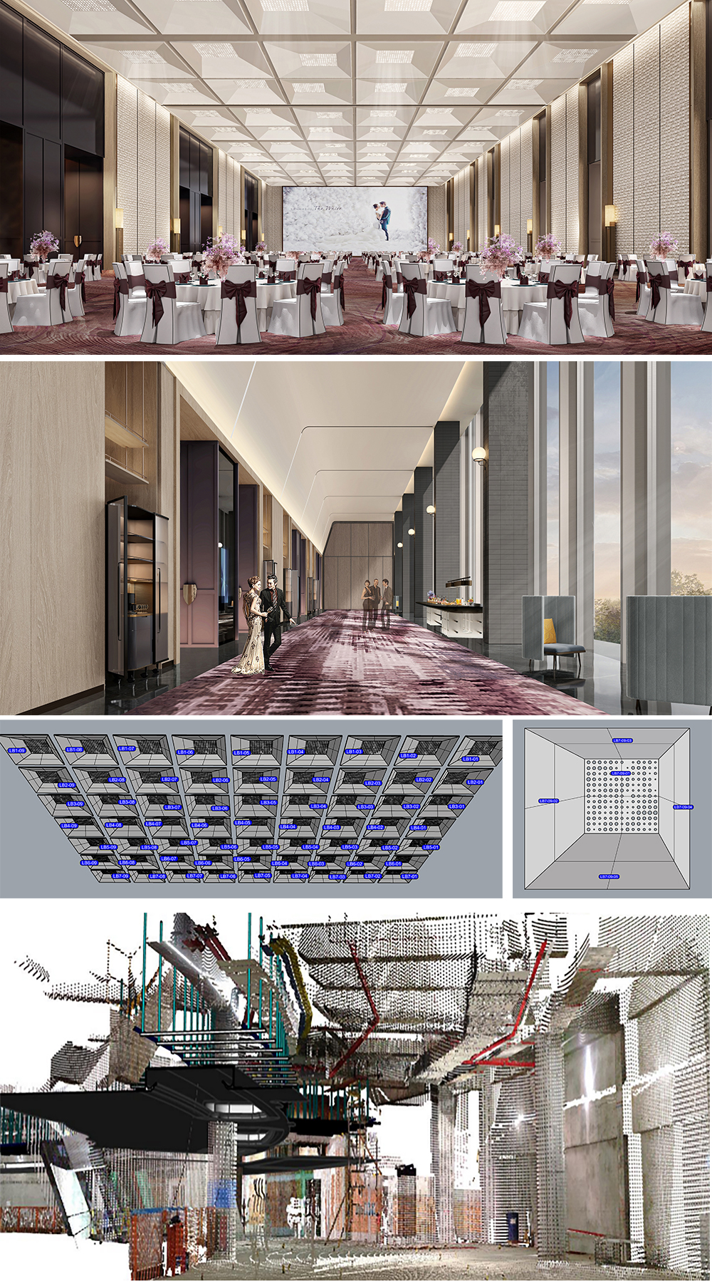 (1)宴会厅吊顶造型利用精确的BIM模型下单代替传统现场测量,大大提高了材料后场加工预制率,工厂预制化数字加工实现激光开孔精度±0.5mm。