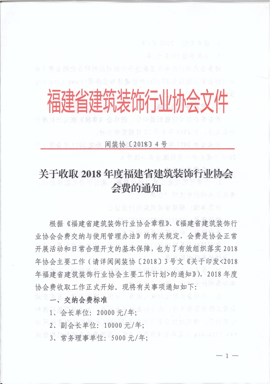 根据《福建省建筑装饰行业协会章程》、《福建省建筑装饰行业协会会费交纳与使用管理办法》的有关规定,会费是协会正常开展活动和日常合理开支的基本保障,也为了有效组织落实2018年协会主要工作(请详阅闽装协〔2018〕3号文《关于印发<2018年福建省建筑装饰行业协会主要工作计划>的通知》),2018年度协会费收取工作正式开始。现将有关事项通知如下: