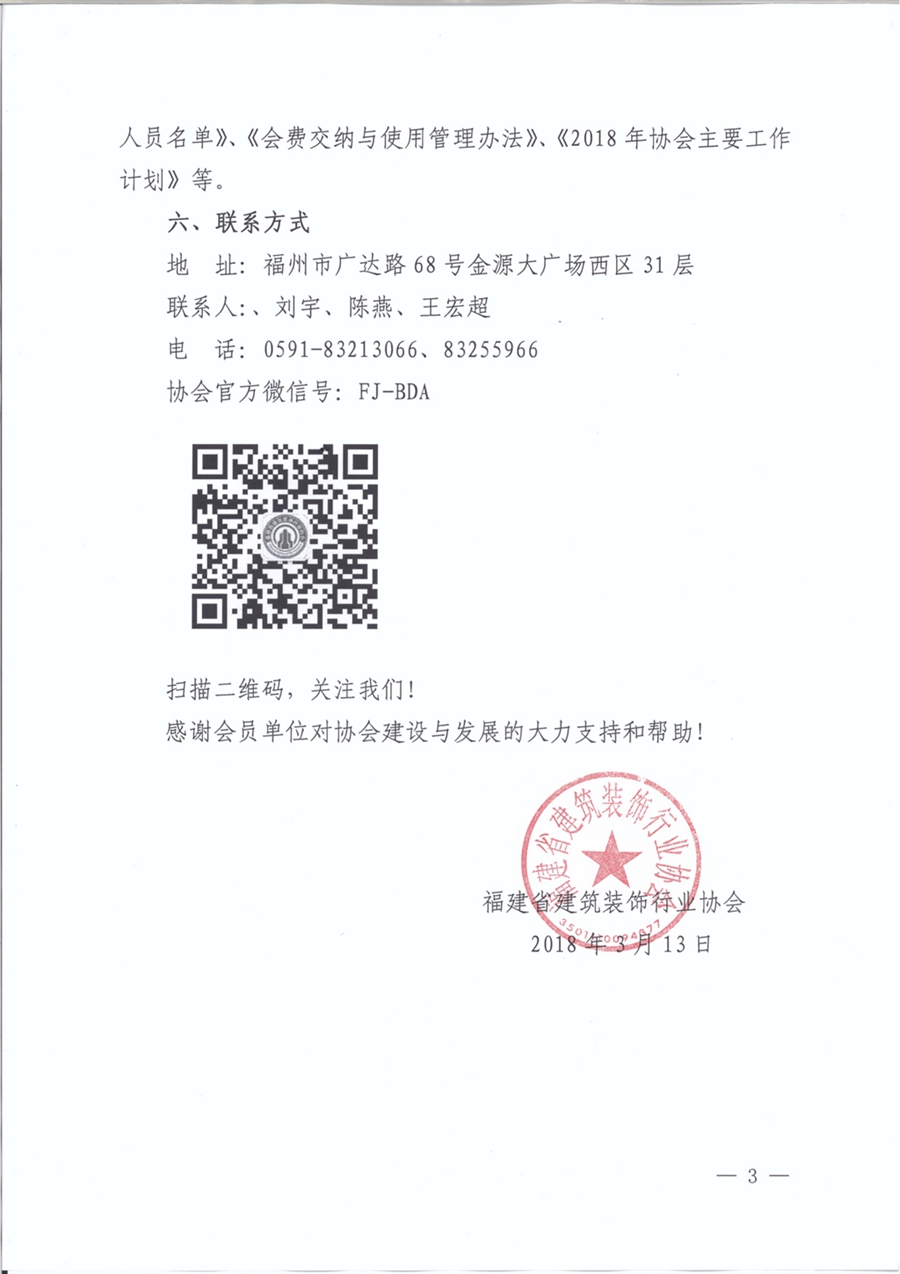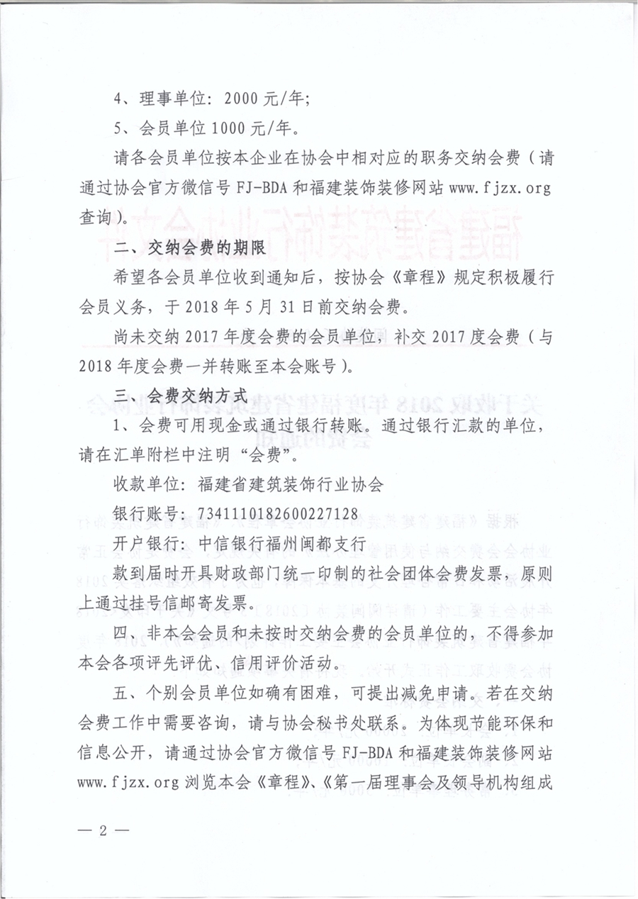 五、个别会员单位如确有困难,可提出减免申请。若在交纳会费工作中需要咨询,请与协会秘书处联系。为体现节能环保和信息公开,请通过协会官方微信号FJ-BDA和福建装饰装修网站www.fjzx.org浏览本会《章程》、《第一届理事会及领导机构组成人员名单》、《会费交纳与使用管理办法》、《2018年协会主要工作计划》等。