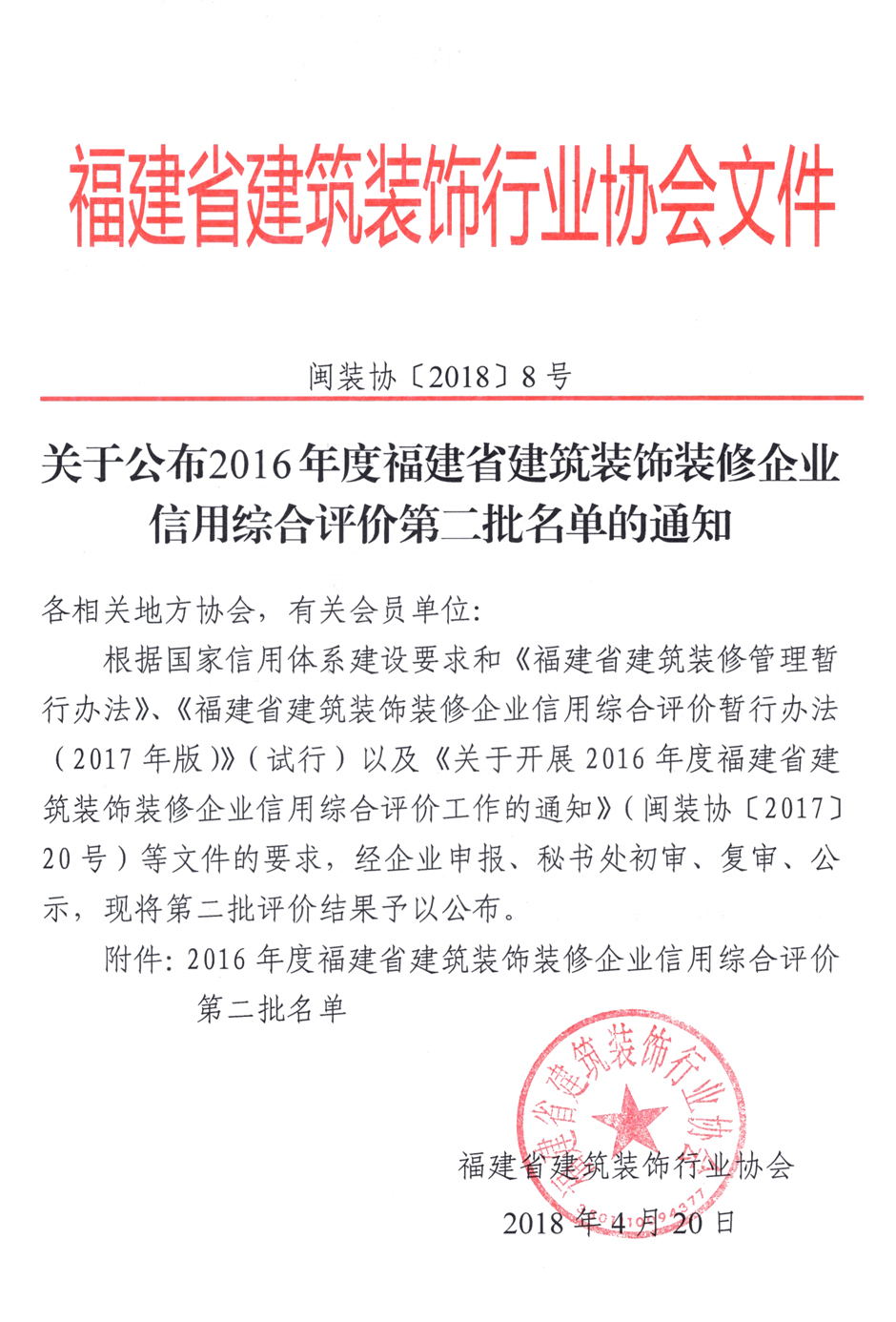 根据国家信用体系建设要求和《福建省建筑装修管理暂行办法》、《福建省建筑装饰装修企业信用综合评价暂行办法(2017年版)》(试行)以及《关于开展2016年度福建省建筑装饰装修企业信用综合评价工作的通知》(闽装协〔2017〕20号)等文件的要求,经企业申报、秘书处初审、复审、公示,现将第二批评价结果予以公布。