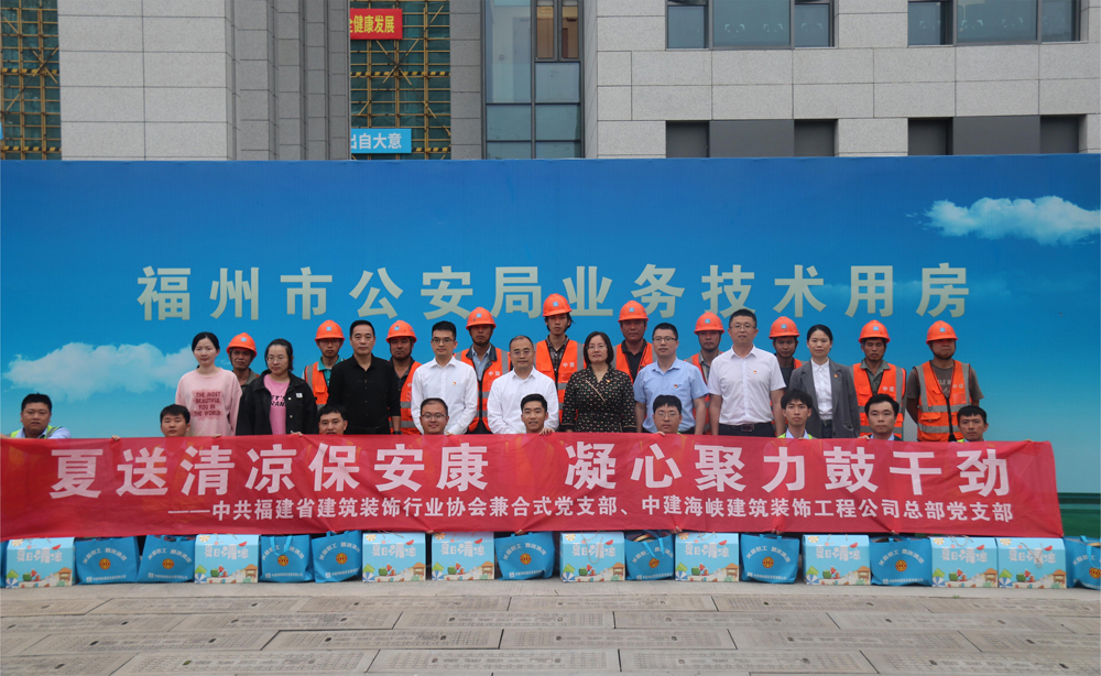 2024年6月4日下午,骄阳似火,热浪袭人。在福州市公安局业务技术用房项目的施工现场,一场充满温情的“夏送清凉保安康 凝心聚力鼓干劲”慰问活动正在火热进行。本次活动由福建省建筑装饰行业协会牵头组织,中共福建省建筑装饰行业协会兼合式党支部与中共中建海峡建筑装饰公司总部党支部联合开展,旨在向酷暑中坚守岗位的一线建设者致以崇高的敬意和诚挚的关怀。