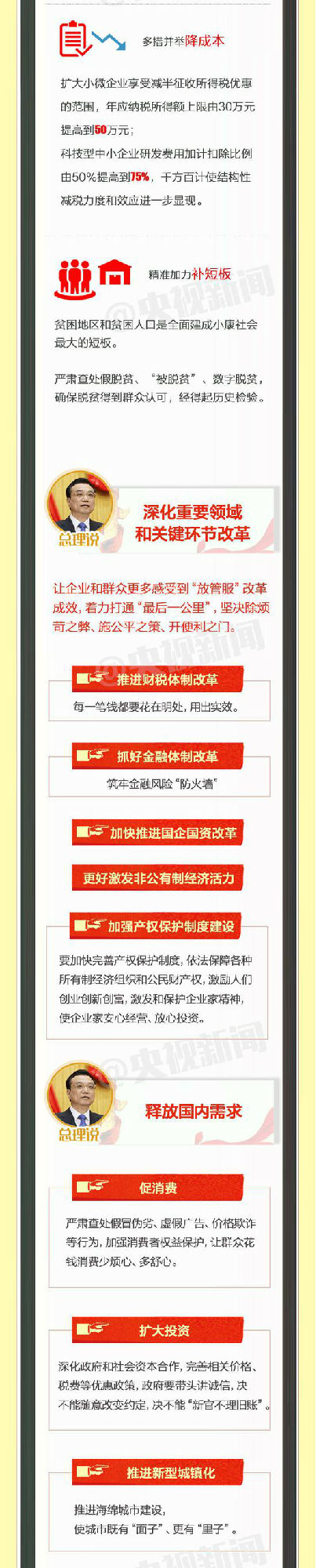 从楼市去库存到严查假脱贫,从政府如何花钱到企业如何创新,从取消手机长途费到提高医保补贴,报告既谈到政府不能“新官不理旧账”,也提出“不让科研人员再为琐事分心”,总理说了啥?真招、实招、硬招都有哪些?
