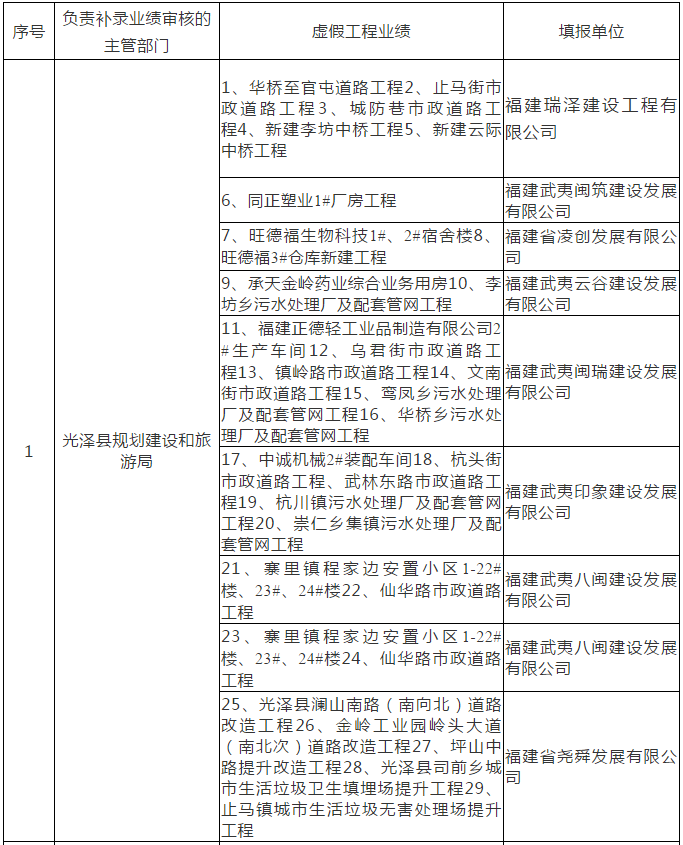 一、光泽县规划建设和旅游局、寿宁县住房和城乡规划建设局、政和县规划建设和旅游局等10家审核单位(详见附件2)对上述企业补录的虚假工程业绩审核把关不严的问题,现予以全省通报批评。省厅将对已发现的福建省建设行业信息公开平台上的虚假工程业绩予以失效处理并上报住房城乡建设部。
