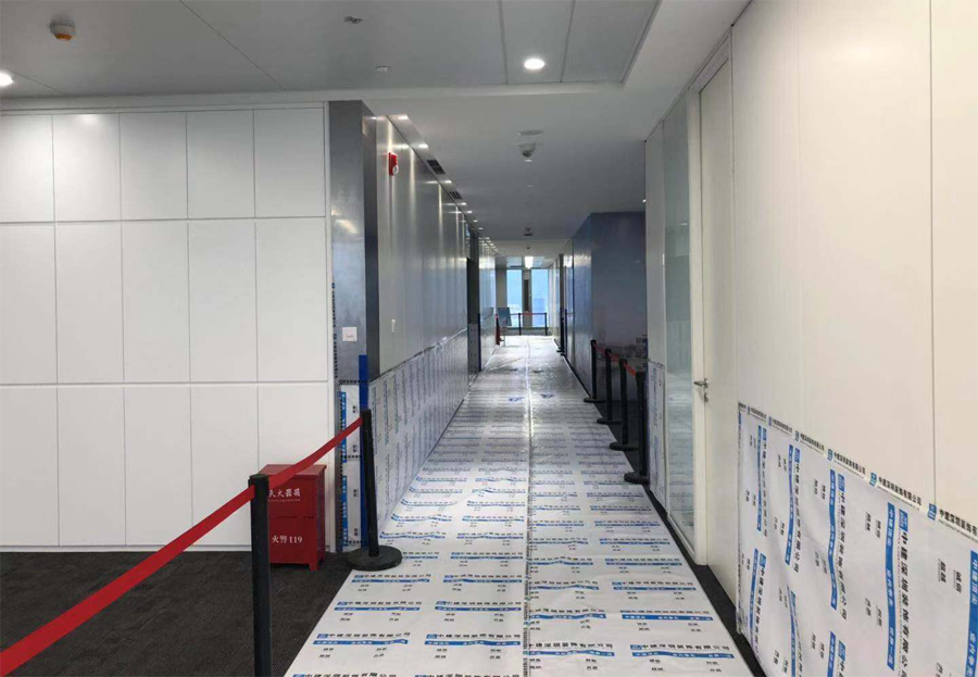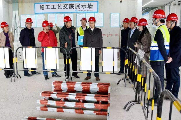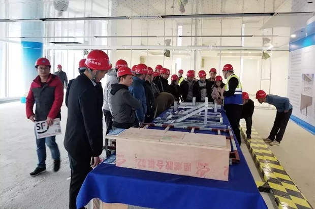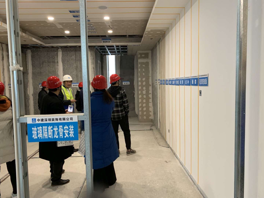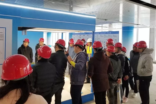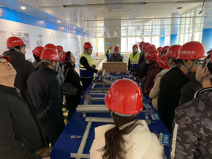 在现场观摩环节,参观人员对公司整洁规范、标准统一的工地形象赞不绝口,对他们“装配式施工”、“样板引路”、“无焊无尘施工”、“无电化施工”、“扫码交底”、每日安全教育制度等一系列创新标准的工艺工法及管控措施频频点头,纷纷向现场管理人员取经。据讲解,公司在兴业银行上大力推广装配式施工,通过将基层构建和面层系统进行集中加工或工厂化组装,既提高了工程效率,也大大提高了工程质量,同时,集中加工区的设置很好促进了现场安全管理,集尘器、无焊接作业等大大改善了工人作业环境,保障了他们的职业健康,实现了绿色健康施工。工程现场展示了大量的便携式蓄电工具,现场管理人员介绍说,这些都是他们提高工人工效,保障工友安全的利器。采用充电机具代替传统的带线接电工具,轻便易操作,提高工人工效的同时,减少了现场临电布置,也大大降低了触电安全隐患,效果非常好。