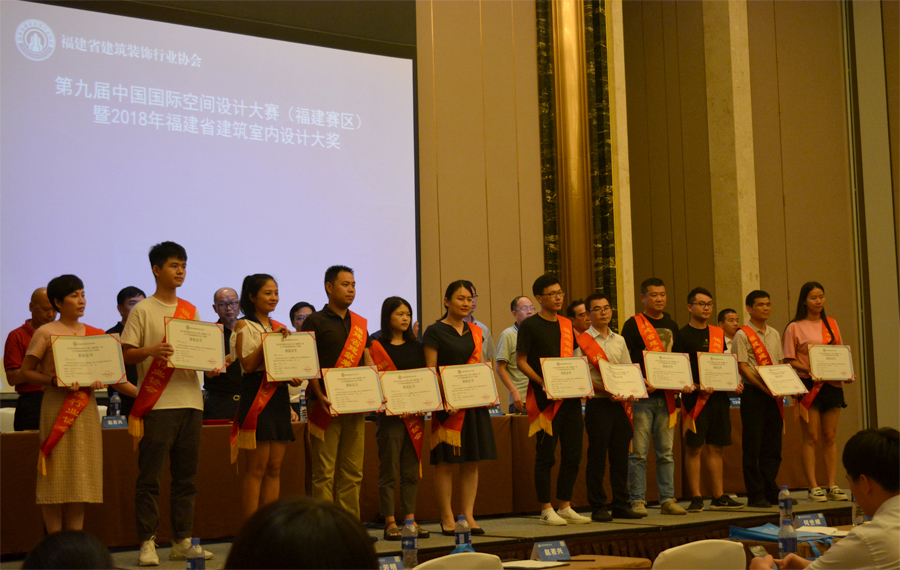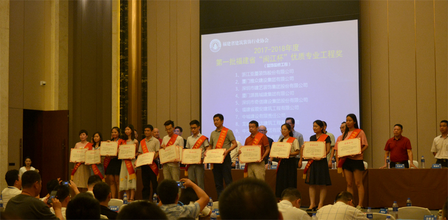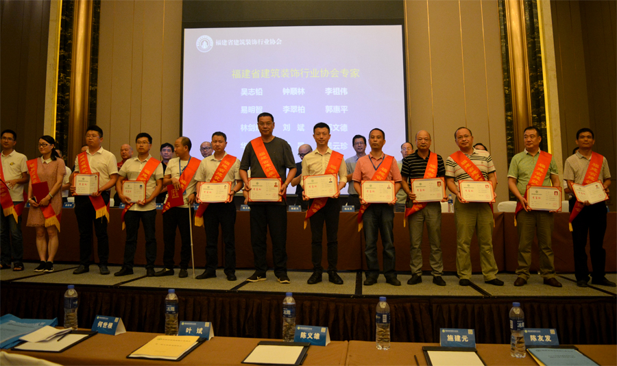 与会领导为福建省建筑装饰行业协会专家颁发证书,为获得2017-2018年度第一批福建省“闽江杯”优质专业工程奖(装饰装修工程)和第九届中国国际空间设计大赛(福建赛区)暨2018年福建省建筑室内设计大奖赛的单位和个人颁奖。