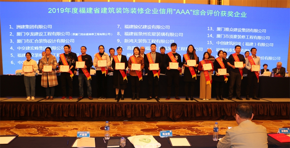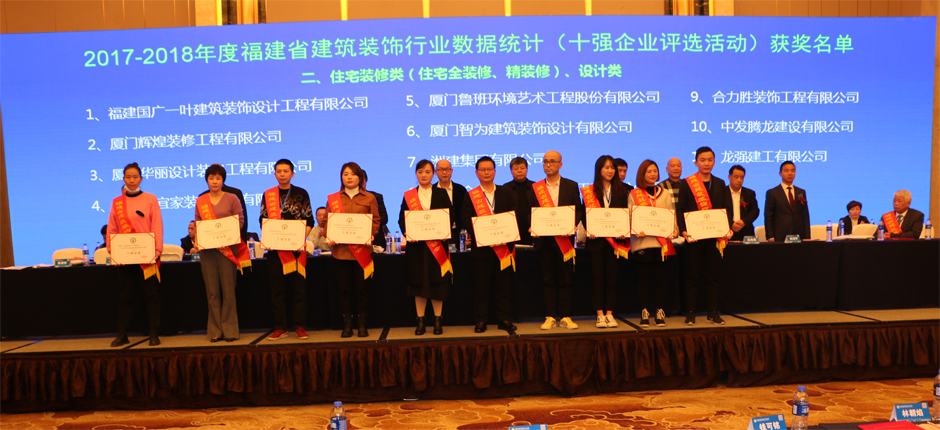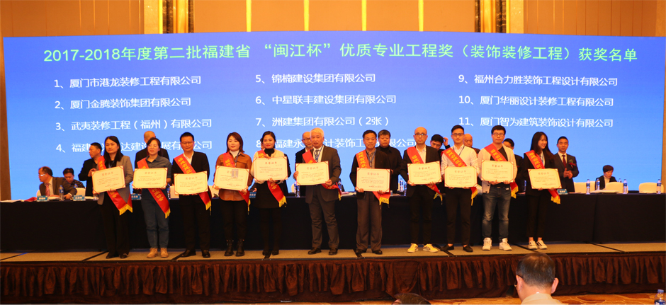 最后,大会举行建筑装饰行业表彰会。对获得2017-2018年度第二批福建省“闽江杯”优质专业工程奖(装饰装修工程)、省建筑装饰行业信用综合评价、数据统计结果等颁奖。对省建筑装饰行业获得中国建筑工程装饰奖等荣誉进行表彰,对抗击疫情、扶贫攻坚、乡村振兴、奉献爱心、热心协会建设等有贡献的会员单位进行表彰。