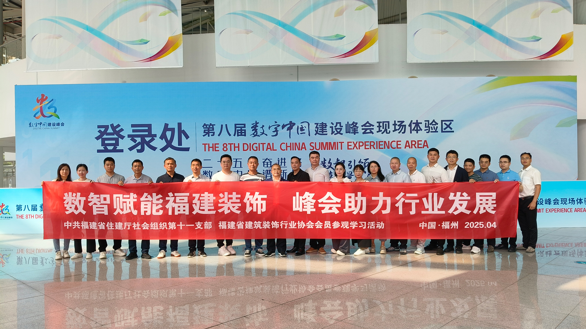 为贯彻落实《关于加快数智引领福建省建筑装饰行业高质量发展的通知》(闽装协〔2025〕6号)文件精神,4月28日下午,中共福建省住建厅社会组织第十一支部联合福建省建筑装饰行业协会,共同组织会员赴福州海峡国际会展中心,集体参观第八届数字中国建设峰会,共探建筑装饰行业数字化转型发展。来自副会长单位龙强建工有限公司、高盛达(福建)建筑装修工程有限公司,监事长单位锦楠建设集团有限公司,常务理事单位福州中博建设发展有限公司、福建华宇建设集团有限公司,理事单位福建省龙圣机电安装有限公司,会员单位福建大艺建设工程有限公司等单位的代表,以及协会专家代表、支部党员和秘书处工作人员共计30人参加活动。