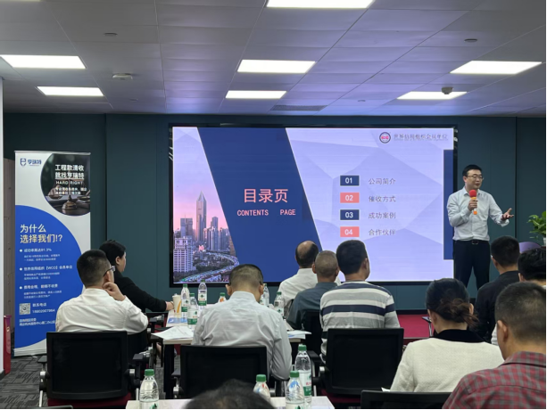 深圳建科副总经理龙彦名向大家详细介绍公司基本情况、催收方式、成功案例、合作伙伴等,为大家生动阐明催收工作取得的效果,为客户解决实际困难提供新的路径选择。