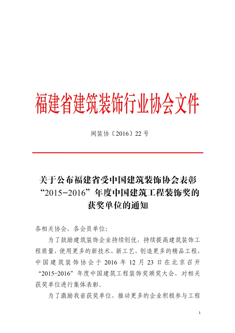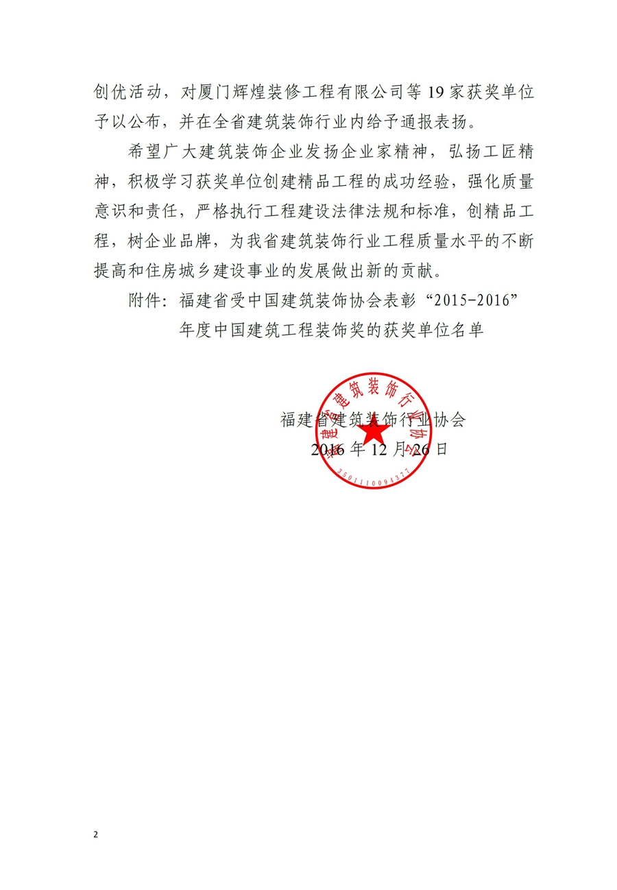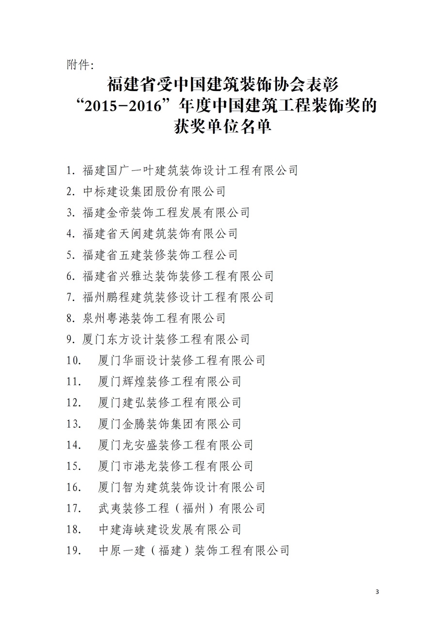关于公布福建省受中国建筑装饰协会表彰“2015-2016”年度中国建筑工程装饰奖的获奖单位的通知