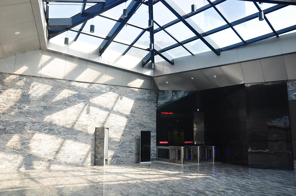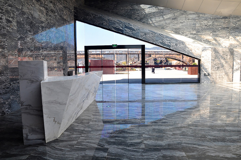 ①序厅具有现代工业风气息的灰色铝塑板、钢结构夹胶玻璃采光天棚,几何线条分割美观大气,利用自然光源与室内迪士灰墙面大理石,地面高仿灰色大理石砖和谐统一,构成光与影的美感。异形爵士白大理石咨询台施工工艺拼接细密、美观,具有现代感。