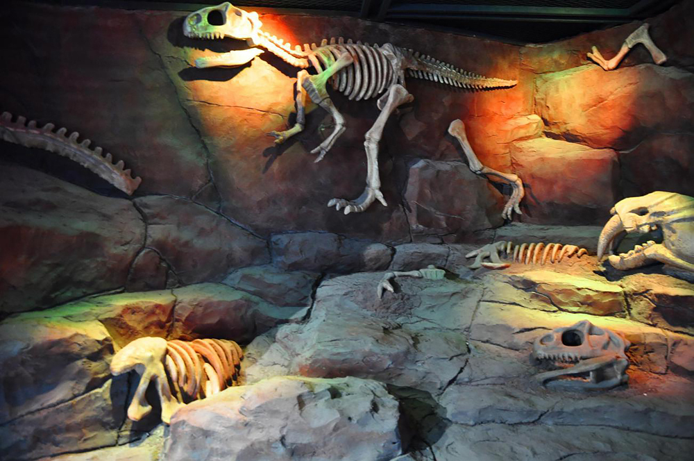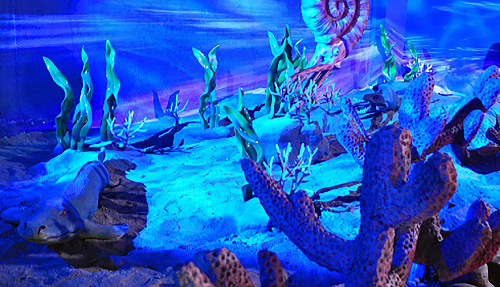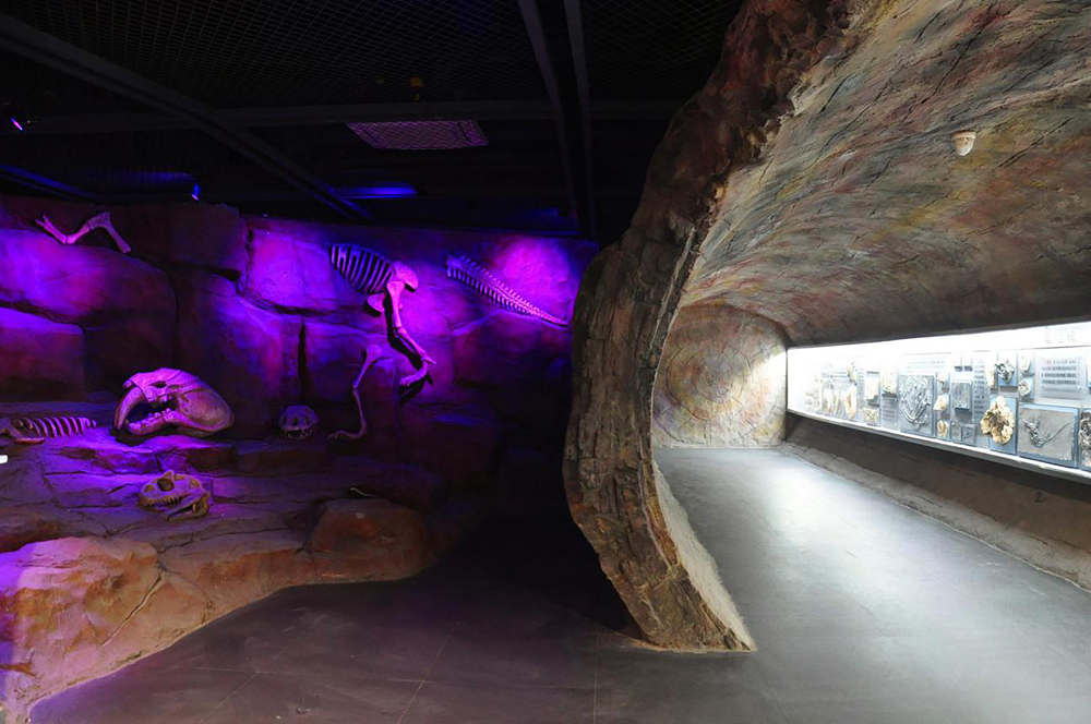 ③时光隧道造景与橱窗真实化石标本和谐统一,真假难辨。