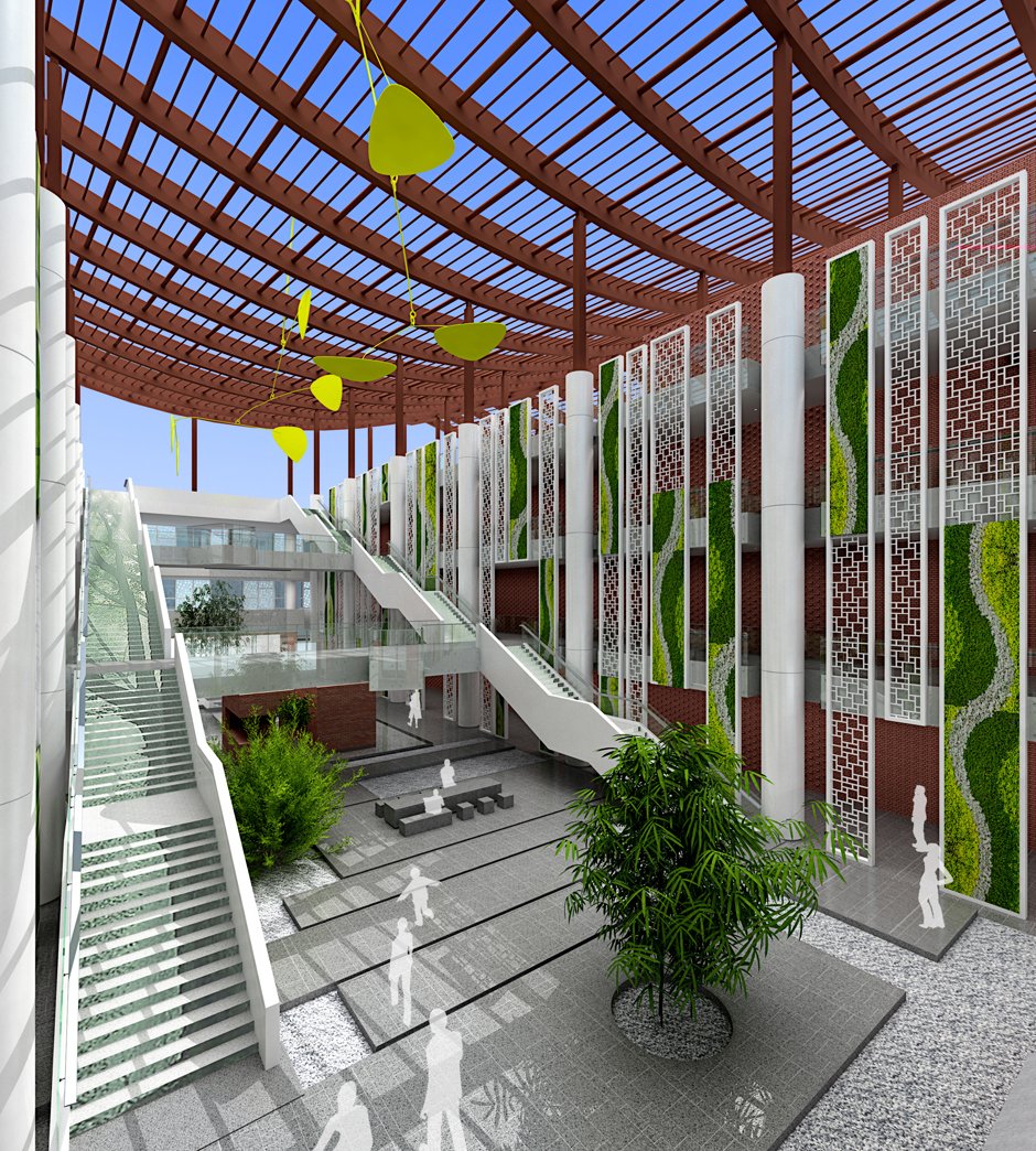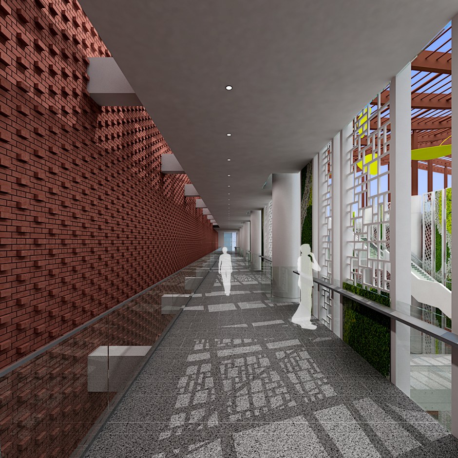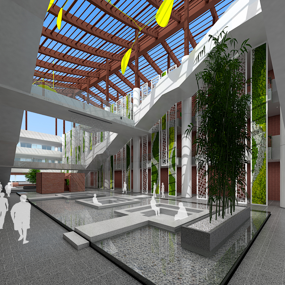 中庭充分利用了原建筑的特色,阳光从优美的屋顶透空骨架间流淌而下,创造出奇幻的光影效果,由建筑外墙引申的闽南红砖造型在中庭得到进一步升华,凹凸有致的红砖与中庭外皮白色的中式花格相映成趣,增加了整个空间的情趣。