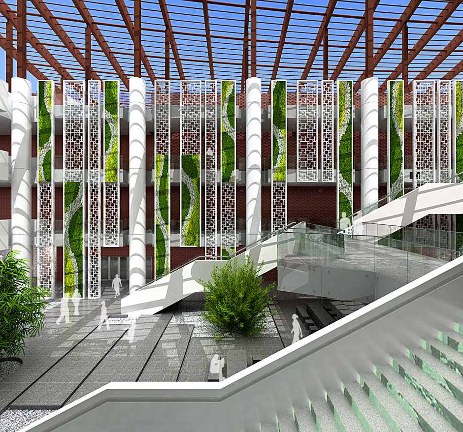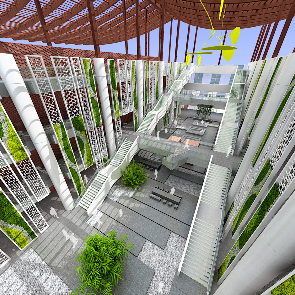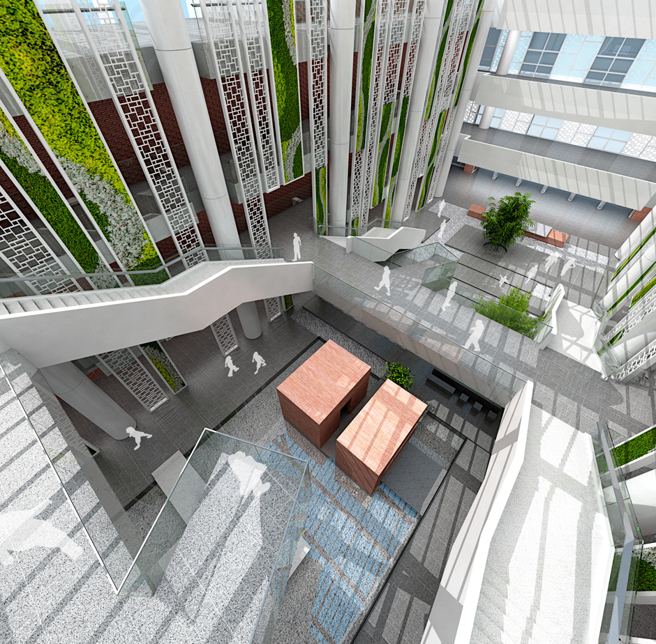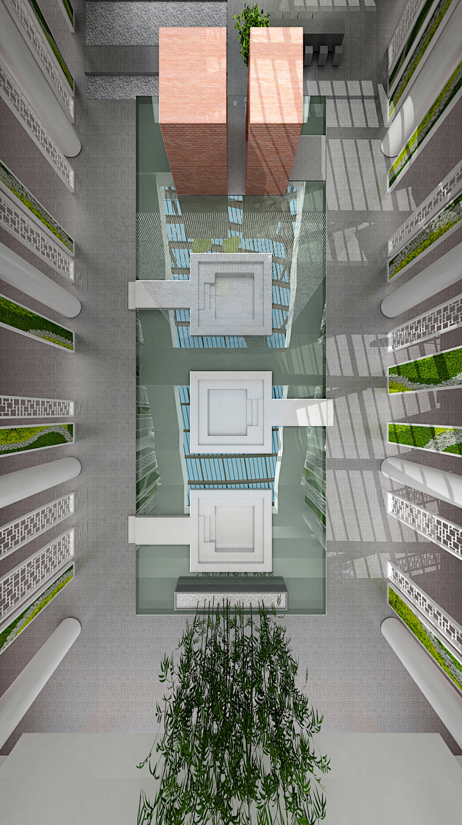 中庭充分利用了原建筑的特色,阳光从优美的屋顶透空骨架间流淌而下,创造出奇幻的光影效果,由建筑外墙引申的闽南红砖造型在中庭得到进一步升华,凹凸有致的红砖与中庭外皮白色的中式花格相映成趣,增加了整个空间的情趣。